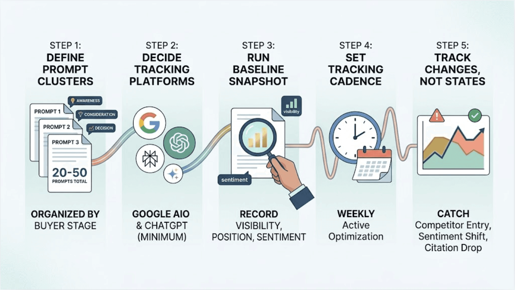 Step 5: Track changes, not just states. The goal isn't a dashboard full of numbers. It's a system that tells you when something meaningful changes: a competitor entering a prompt set where they weren't before, a sentiment shift following a product controversy, a citation drop after a site migration.