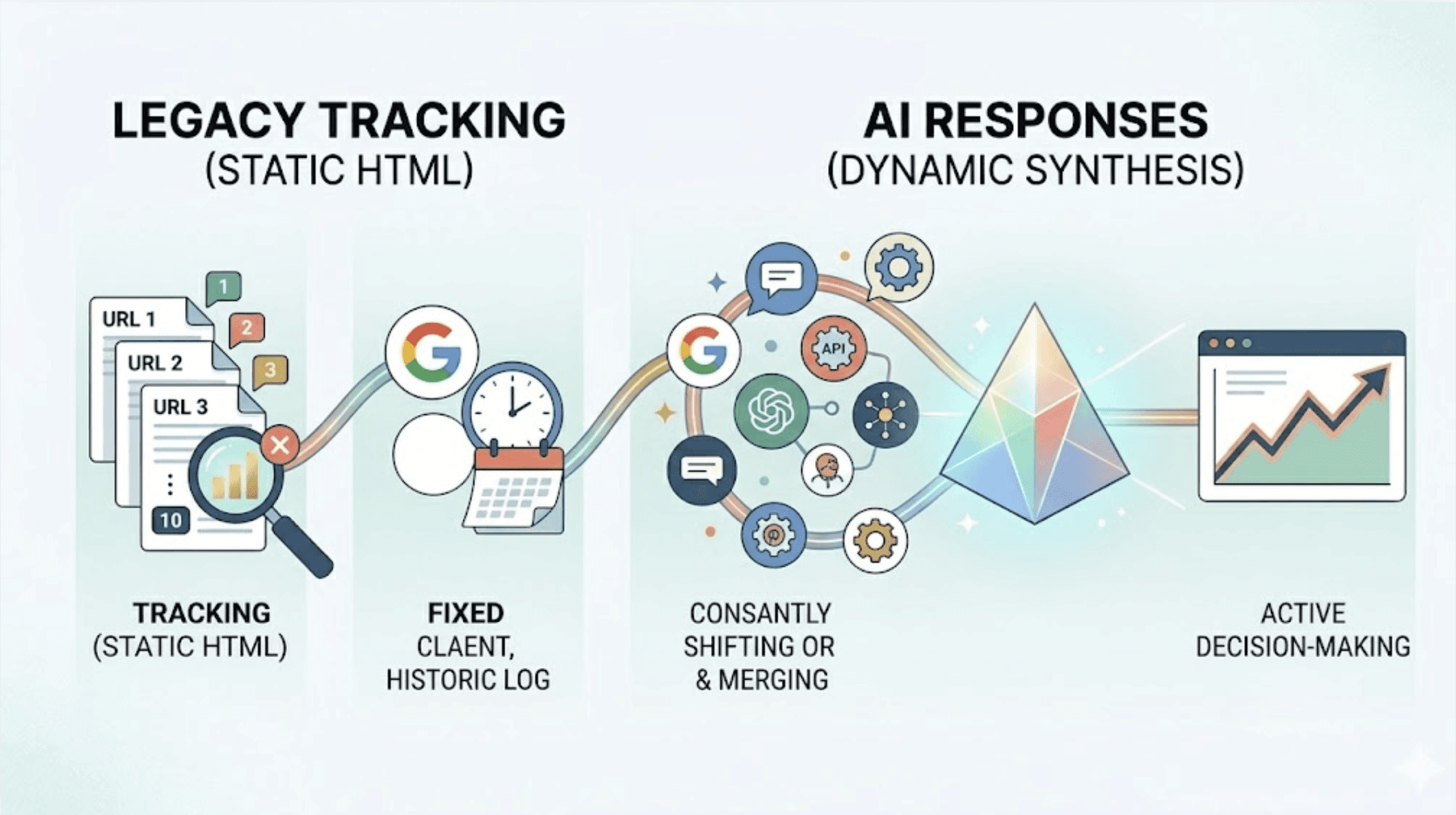 Traditional crawlers are built to parse static HTML. AI responses are generated in real time, synthesized from dozens of background queries the tool never sees. There's no stable URL to crawl, no position 1 through 10 to log. Your legacy infrastructure isn't broken. It's just tracking something that no longer drives the decision.