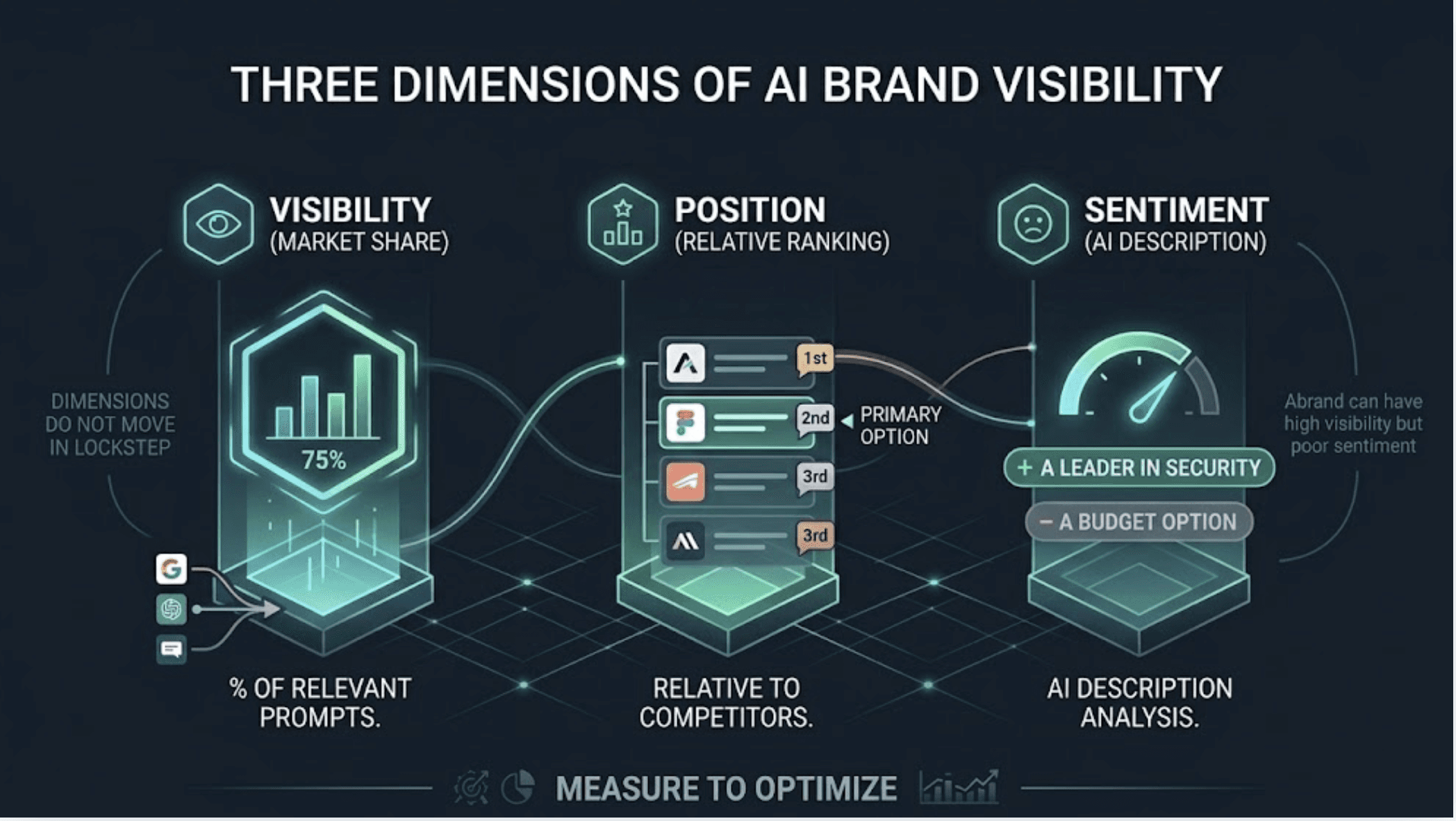 These three dimensions don't move in lockstep. A brand can have high visibility but poor sentiment. Strong position on ChatGPT and near-zero presence on Google AI Overviews. You can't optimize what you aren't measuring.