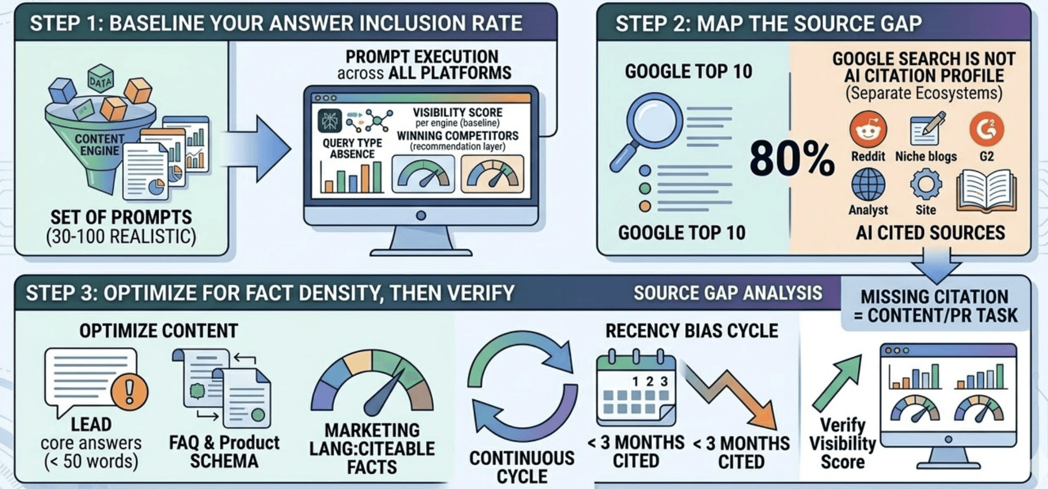 Step 1: Baseline your Answer Inclusion Rate. Build a set of 30 to 100 prompts your target customer would realistically ask an AI assistant in your category. Run them across platforms. The output tells you your current visibility score per engine, which competitors are winning the recommendation layer, and which query types your brand is completely absent from. This number is your starting point for everything else.