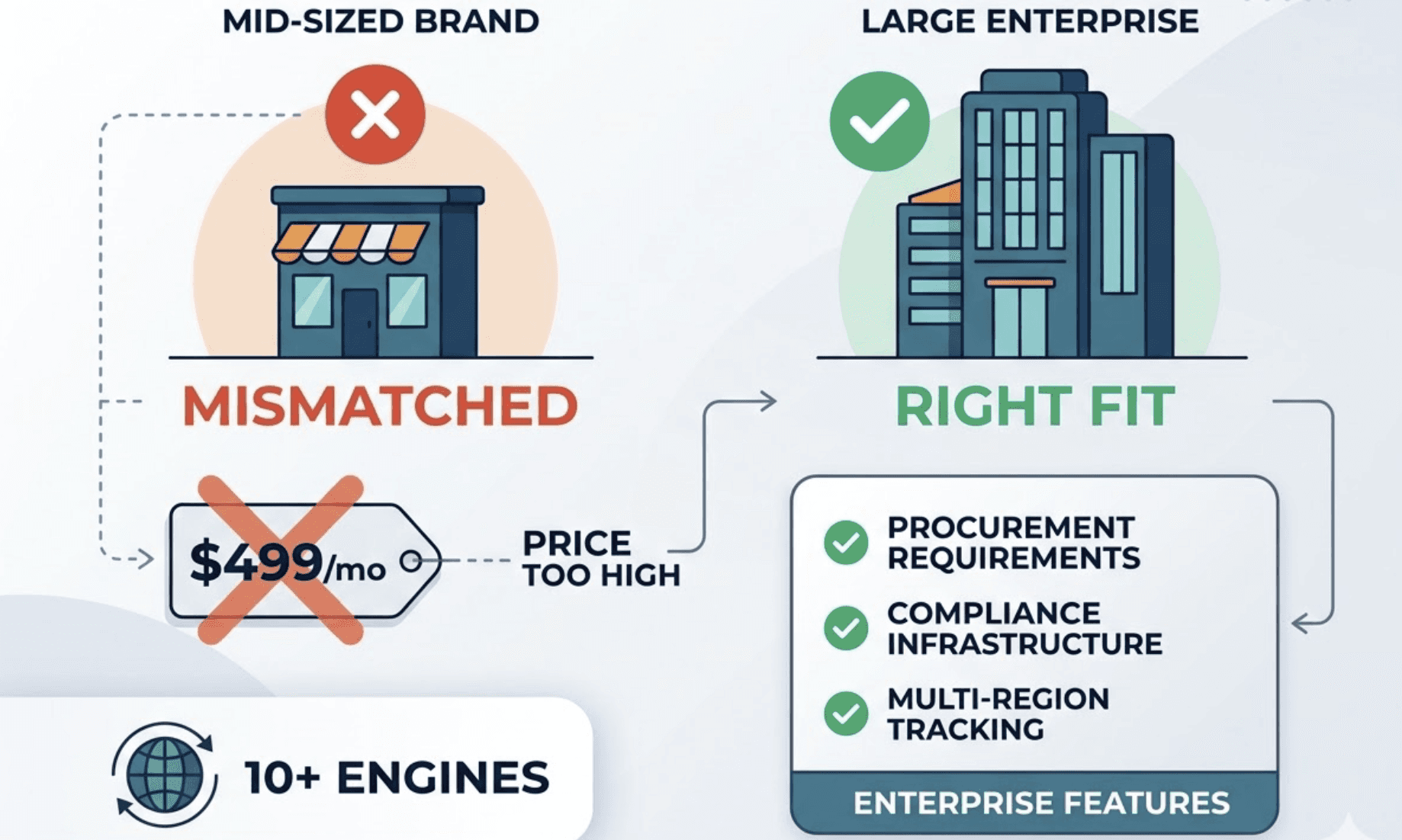 The platform covers 10+ engines, matches Topify's breadth, and adds compliance and multi-region corporate tracking infrastructure. The $499/mo entry point reflects that focus. For a mid-sized brand, the price and feature set are both mismatched. For a large enterprise with procurement requirements and multi-region legal obligations, it may be the right fit.