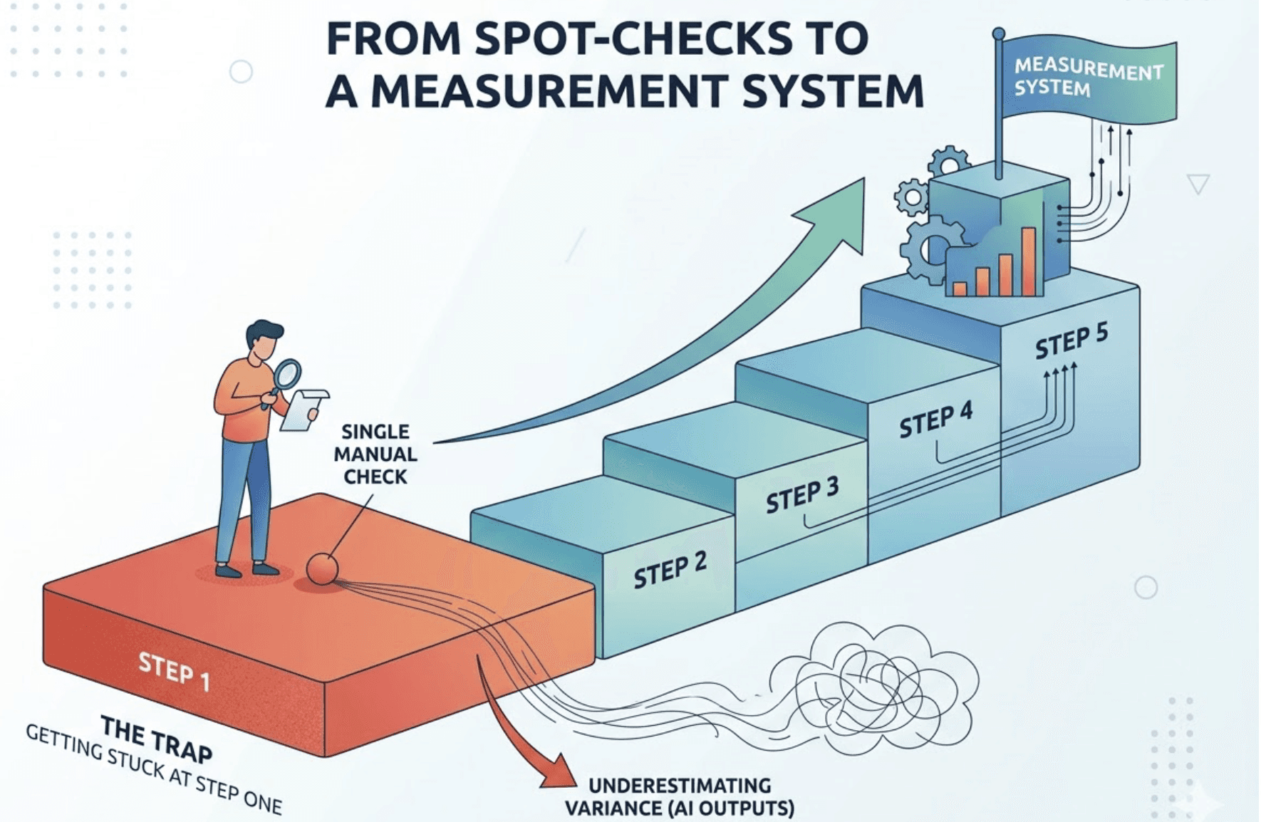 Getting from manual spot-checks to a real measurement system takes five steps. Most teams get stuck at step one because they underestimate the variance in AI outputs — a single manual check on a single day captures almost nothing meaningful.