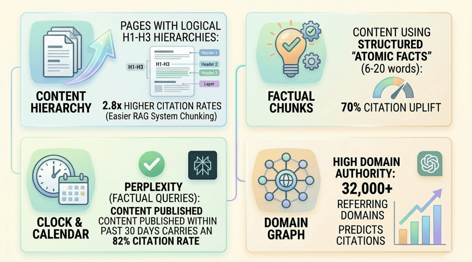 Content using structured "atomic facts" (6-20 words) receives a 70% citation uplift