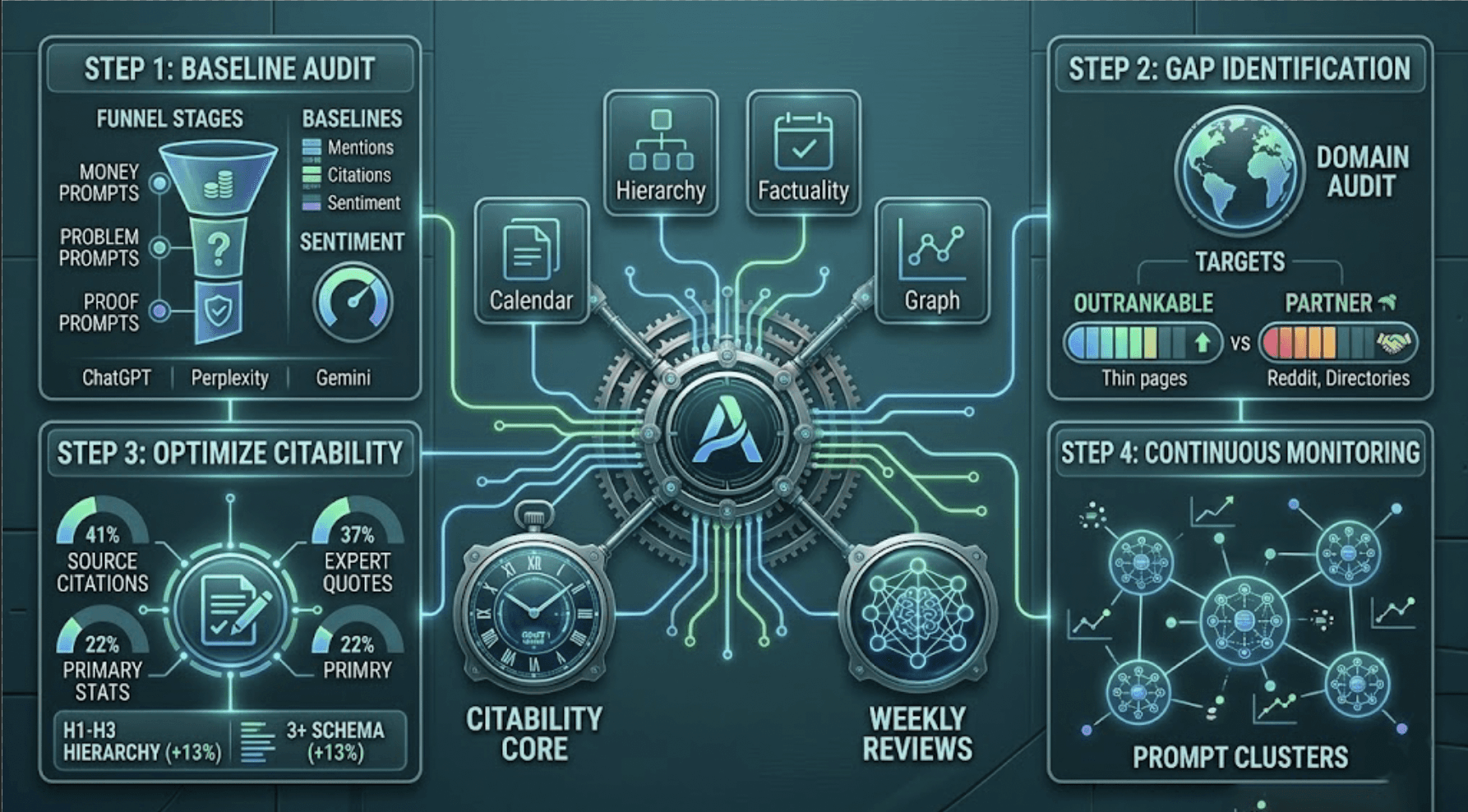 Step 4: Continuous monitoring. Weekly reviews of prompt clusters allow teams to detect citation drift and respond to new competitor entries or platform sourcing changes. AI models update frequently; a citation position held today isn't guaranteed next month.
