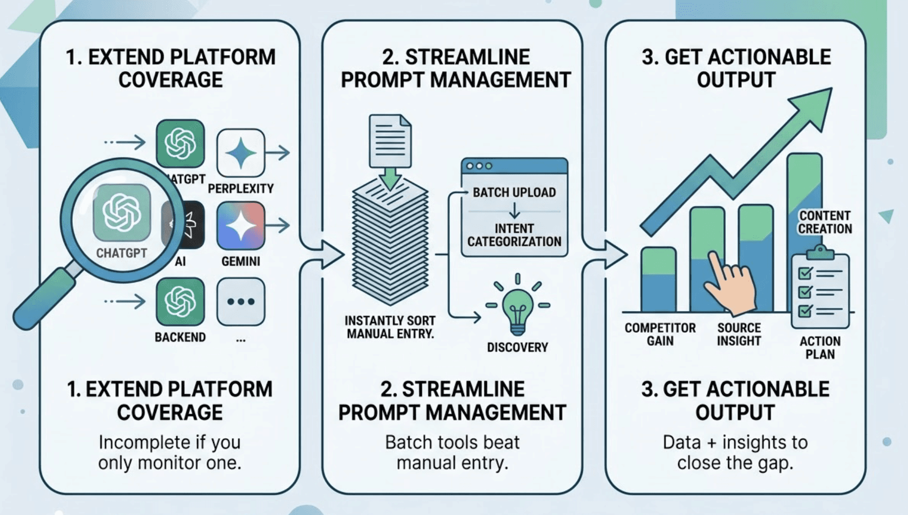 The third is whether the tool provides actionable output or just data. Dashboards that show you a drop in visibility are useful. Dashboards that also tell you which competitor gained, which source drove the change, and what content you'd need to publish to close the gap, are valuable.