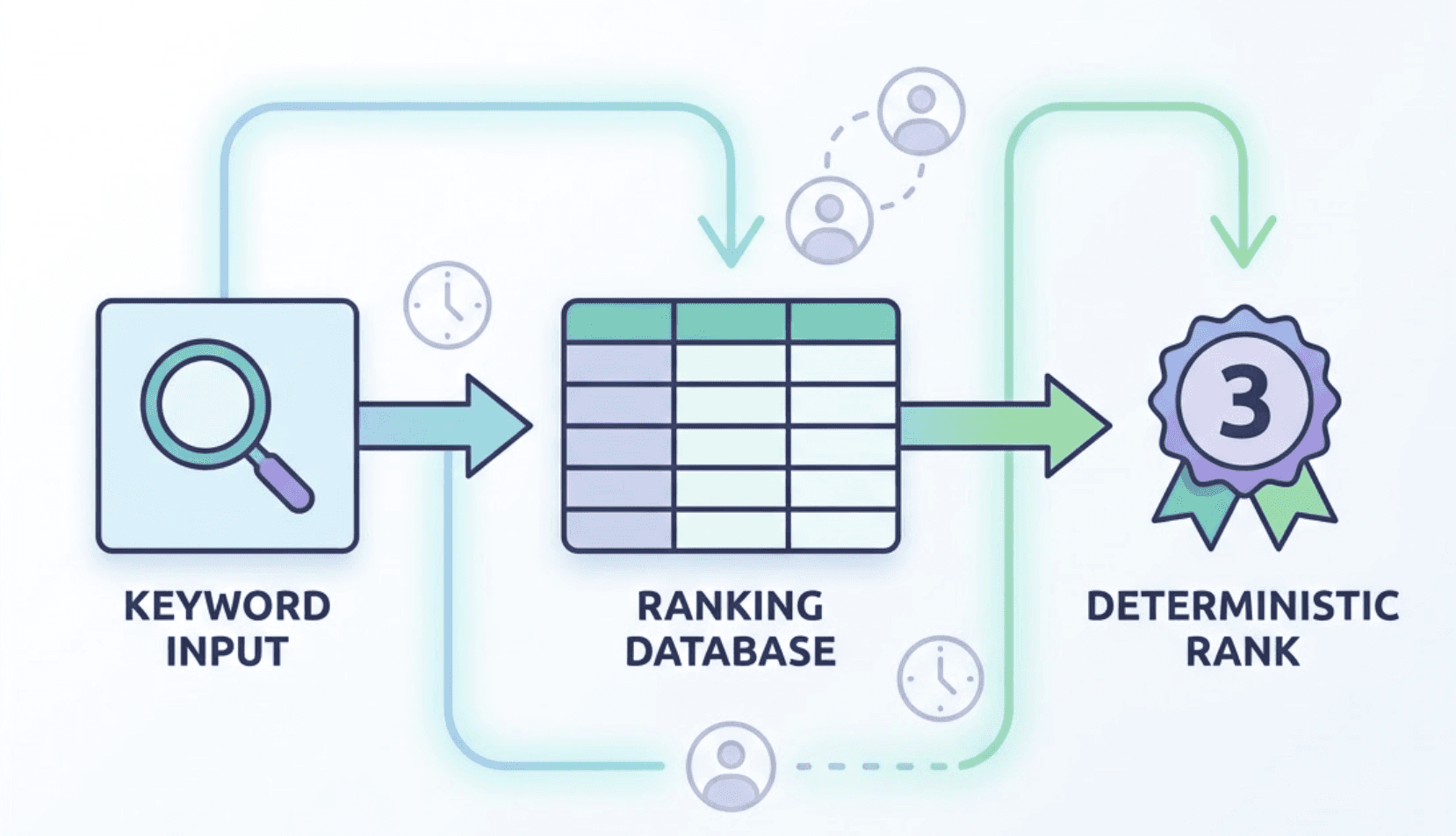 Google rank tracking is deterministic. A page either ranks at position 3 for a keyword or it doesn't. The result is consistent across queries, users, and time windows. Tracking it is straightforward: input keyword, get rank.