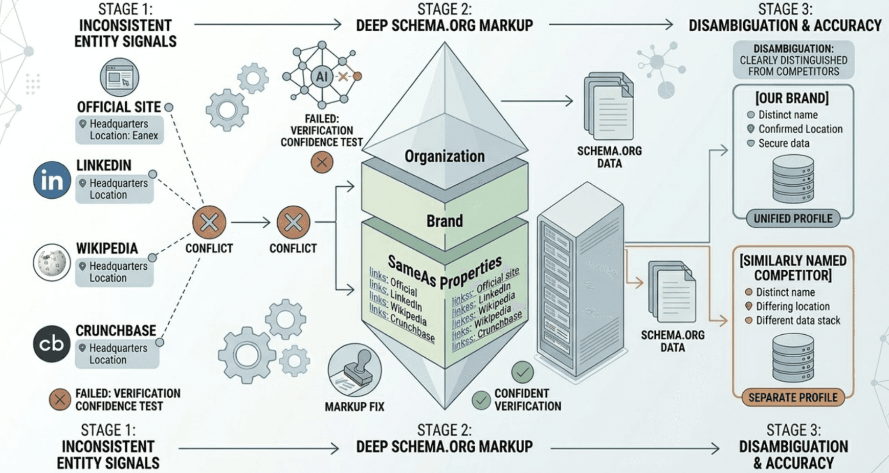 AI models navigate the web as a network of interconnected entities. If your company's legal name, headquarters location, or founding date appears inconsistently across your official site, LinkedIn, Wikipedia, and Crunchbase, you fail what researchers call the "Verification Confidence" test. Deep Schema.org markup using Organization, Brand, and SameAs properties is the primary fix. Without this, models can't disambiguate you from similarly named competitors.