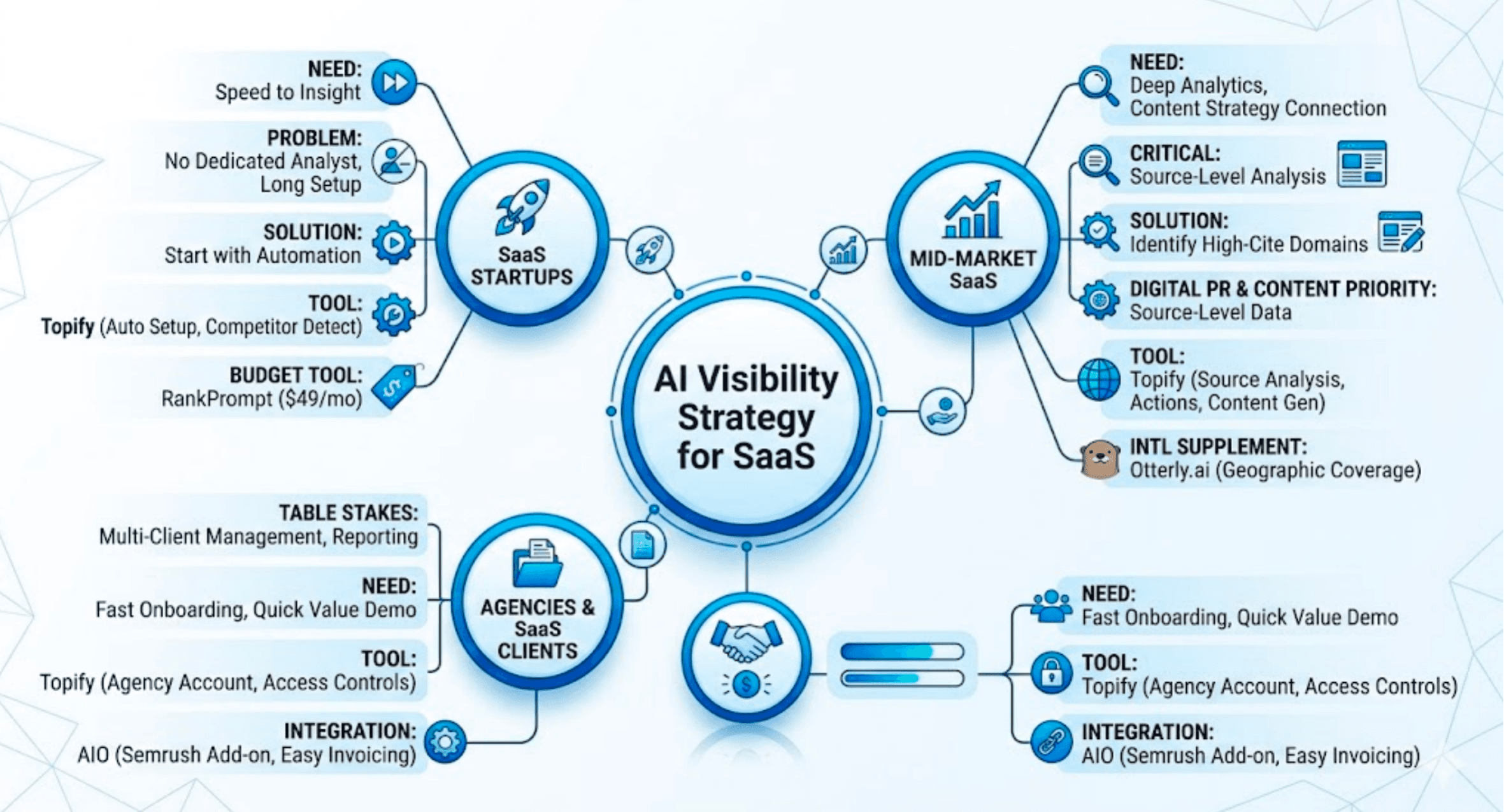 You need speed to insight. You don't have a dedicated GEO analyst, and you probably can't afford to spend two weeks configuring a platform before seeing your first data point. Start with a tool that automates setup — Topify's automated prompt generation and competitor detection is built exactly for this. Paste your URL, review the auto-generated prompts, and you're tracking visibility within minutes. If budget is extremely tight, RankPrompt at $49/month gives you accurate data, though you'll spend more time on manual configuration.