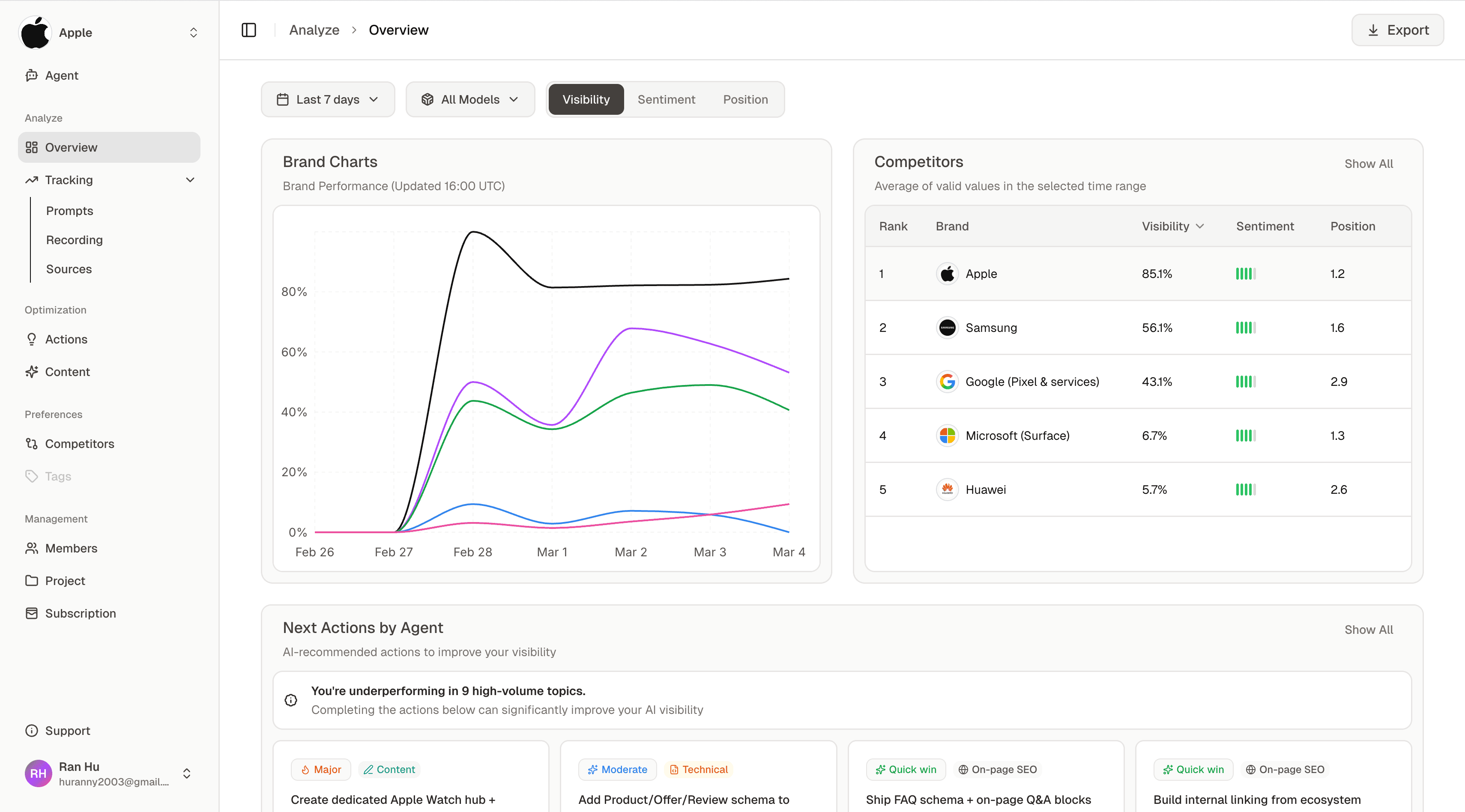 The dashboard consolidates four core dimensions — AI Volume, Visibility, Sentiment, and Position — across ChatGPT, Perplexity, Google AI Overview, and Gemini. And critically, Topify doesn't just show "what happened." It explains why metrics changed and what to do next. We're currently rolling out an Actions feature with system-recommended optimization steps, priority levels, and estimated effort — essentially turning insights into a GEO workflow you can execute through an agent-driven approval process.