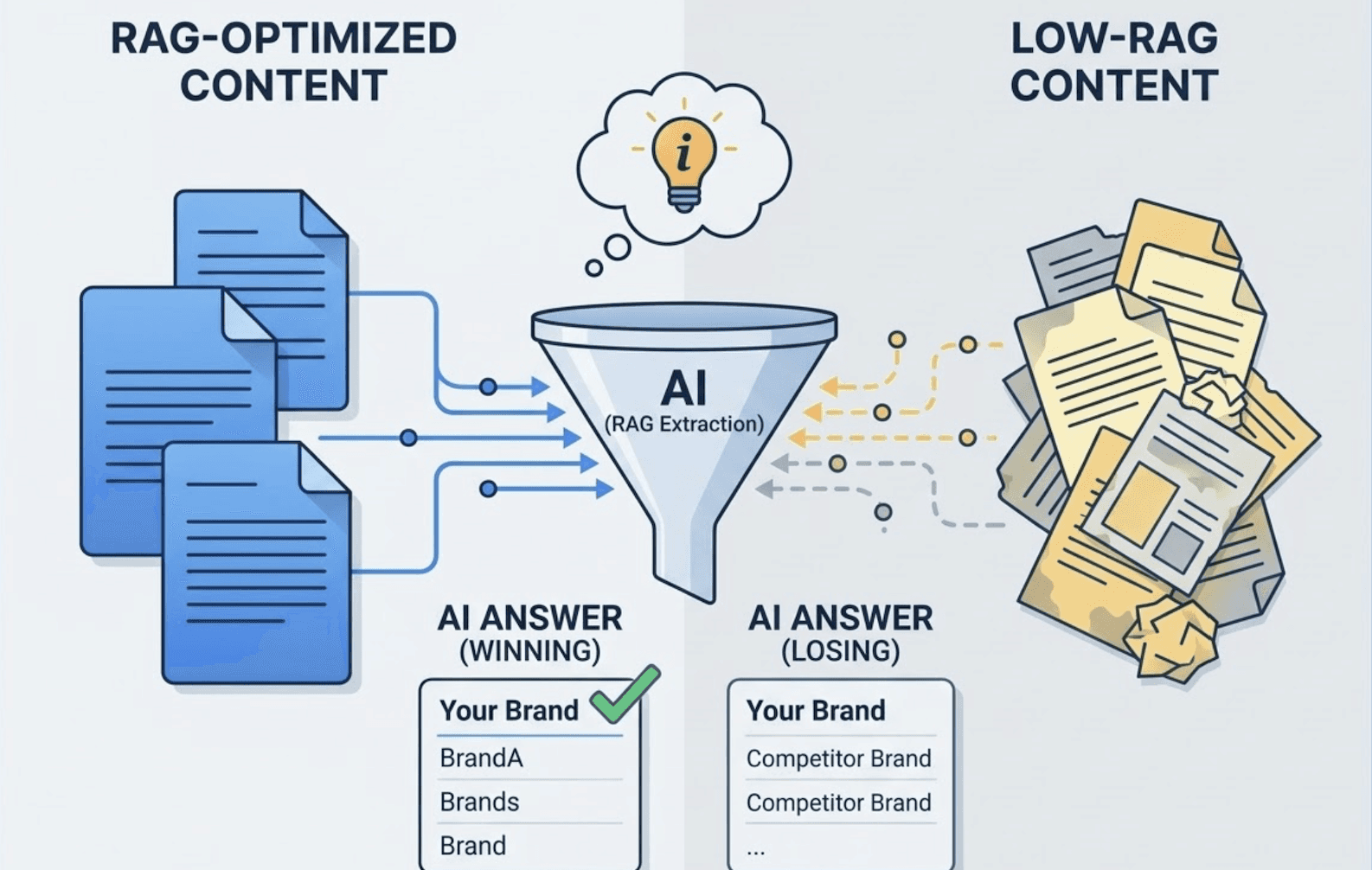 What gets retrieved through RAG isn't random. Content containing statistics and specific data points shows up to 40% higher AI citation rates than content without them. Content structured with clear H2/H3 headings, FAQ schema, and declarative answer-first summaries is far easier for RAG systems to extract.