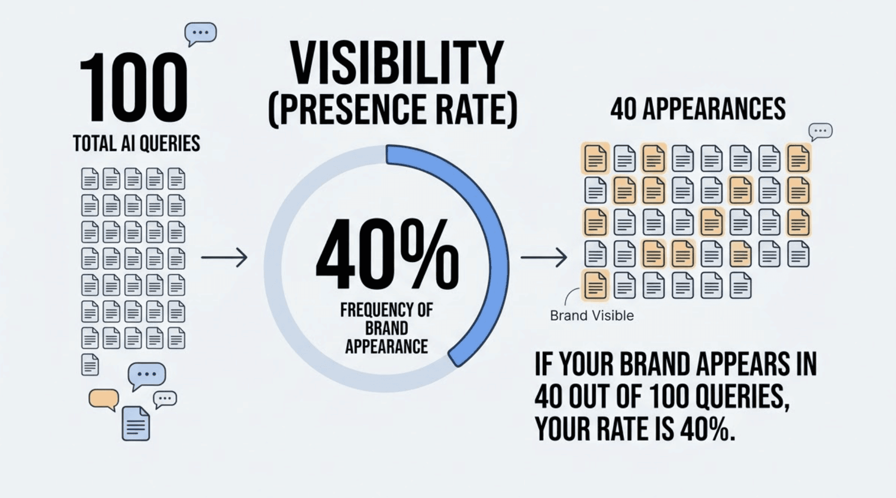 Visibility (Presence Rate): How often your brand appears in AI responses across a defined set of prompts. If you show up in 40 out of 100 queries in your category, your visibility rate is 40%.