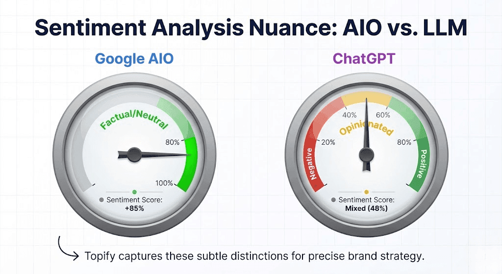 Google AI Overviews tend to be neutral and factual. ChatGPT can be opinionated. Topify distinguishes between these distinct "brand personalities." It might report that your sentiment is 90% Positive on Google (due to good reviews) but only 50% on ChatGPT (due to outdated training data). This nuance is critical for reputation management.