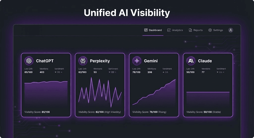 Unified Dashboard: View your visibility on ChatGPT, Perplexity, Gemini, and Claude side-by-side.