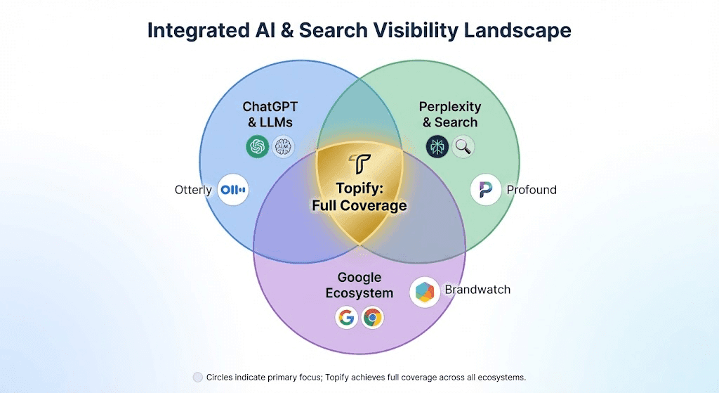 Topify is engineered specifically for the multi-platform reality. It doesn't force you to choose between tracking Chat or Search; it tracks the concept of the Brand Entity across both.