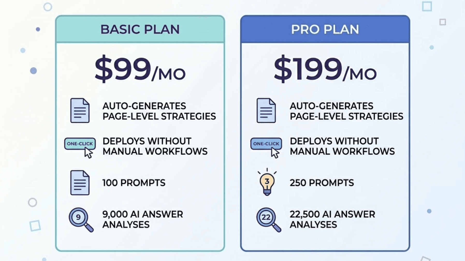 For teams that want to move from insight to execution, Topify's One-Click Agent Execution auto-generates page-level strategies for visibility gaps and deploys them without manual workflows. The Basic plan starts at $99/month with 100 prompts and 9,000 AI answer analyses. The Pro plan scales to 250 prompts and 22,500 analyses at $199/month.