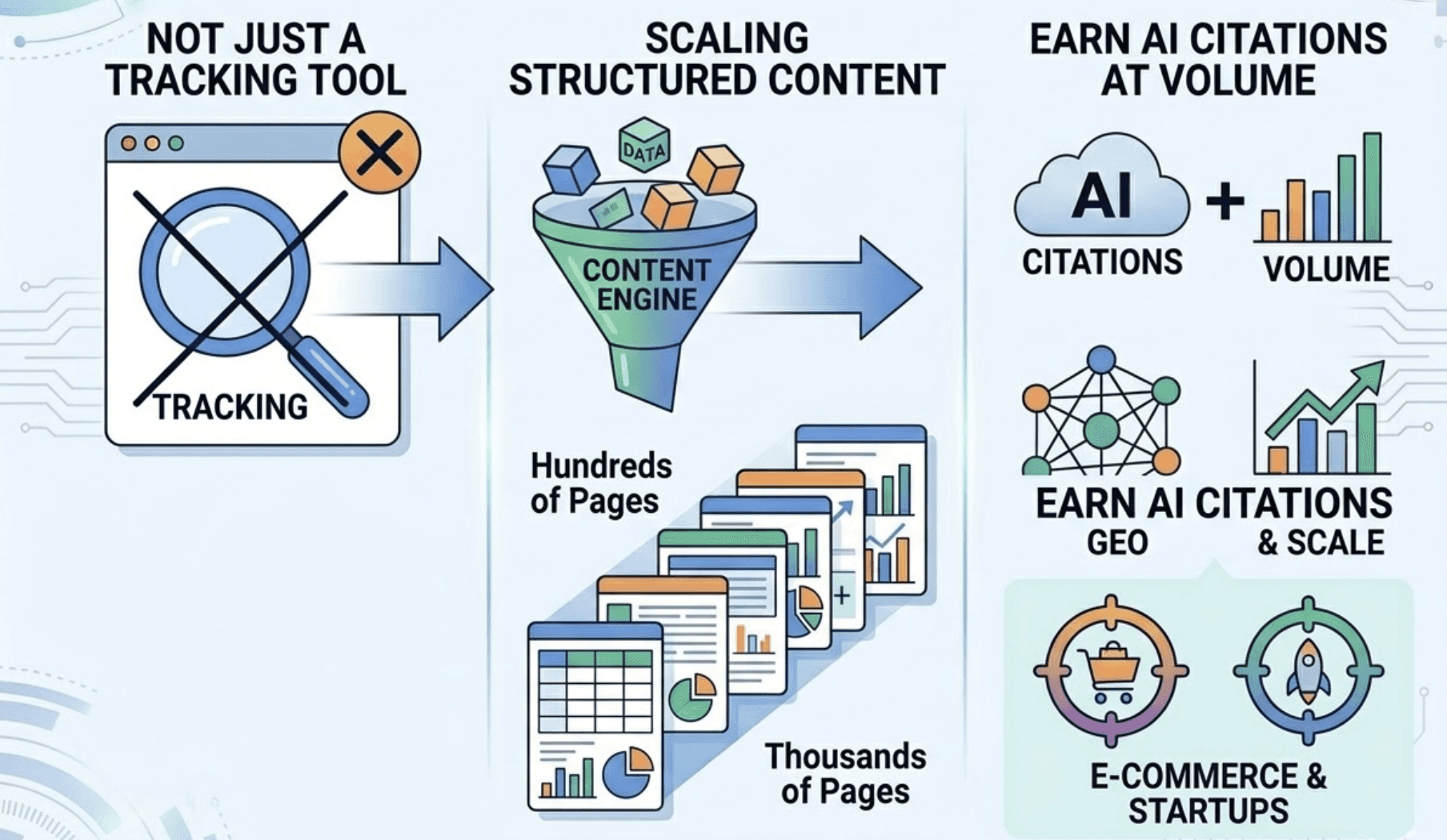 Its Comet v2 engine identifies long-tail query patterns with commercial intent and generates content optimized for AI extraction. The Reviewer Agent performs automated quality checks before publication. For brands with large product catalogs or location-based pages, this programmatic approach can dramatically accelerate the content surface area available for AI citation.