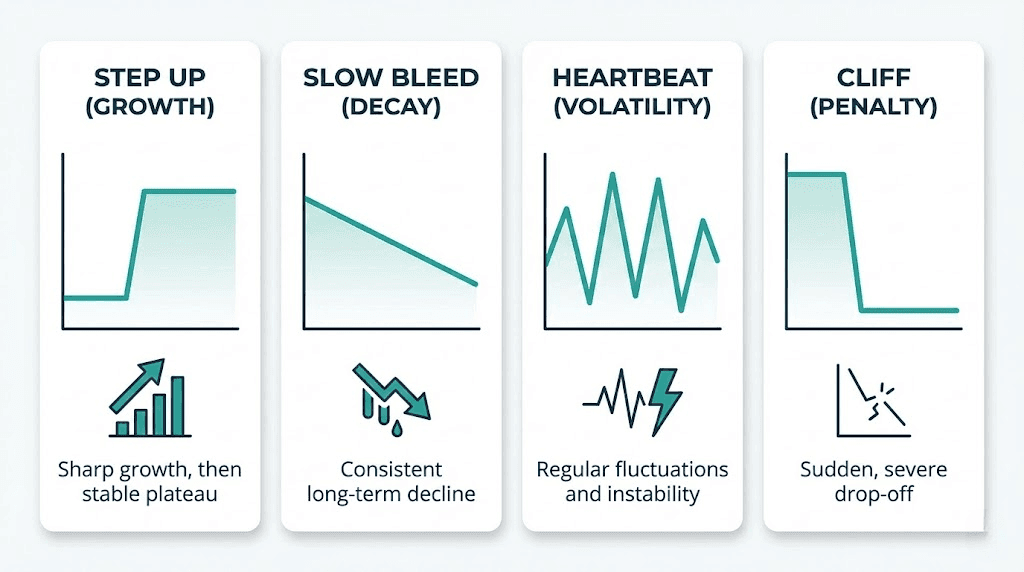 When you learn how to track AI Overviews rankings over time, you will start to see four distinct shapes in your data.