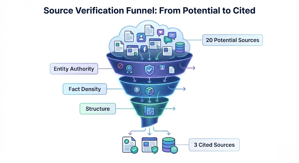 When a user asks a question like "What is the best CRM for fintech?", the generative engine goes through a millisecond-by-millisecond decision process to select its sources.
