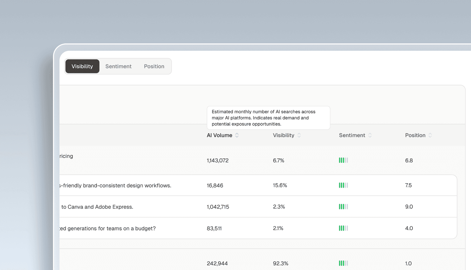 Position measures where a brand appears in AI responses relative to competitors, indicating whether it is mentioned first or ranked after other brands.