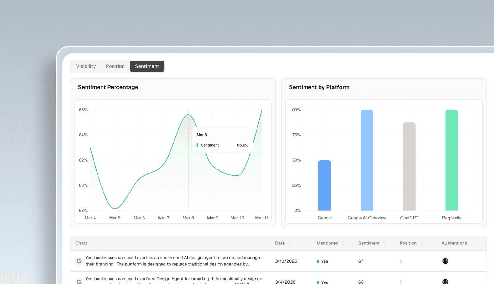 Sentiment measures the tone of AI responses when mentioning a brand, indicating whether the brand is described positively, neutrally, or negatively on a 0–100 scale.
