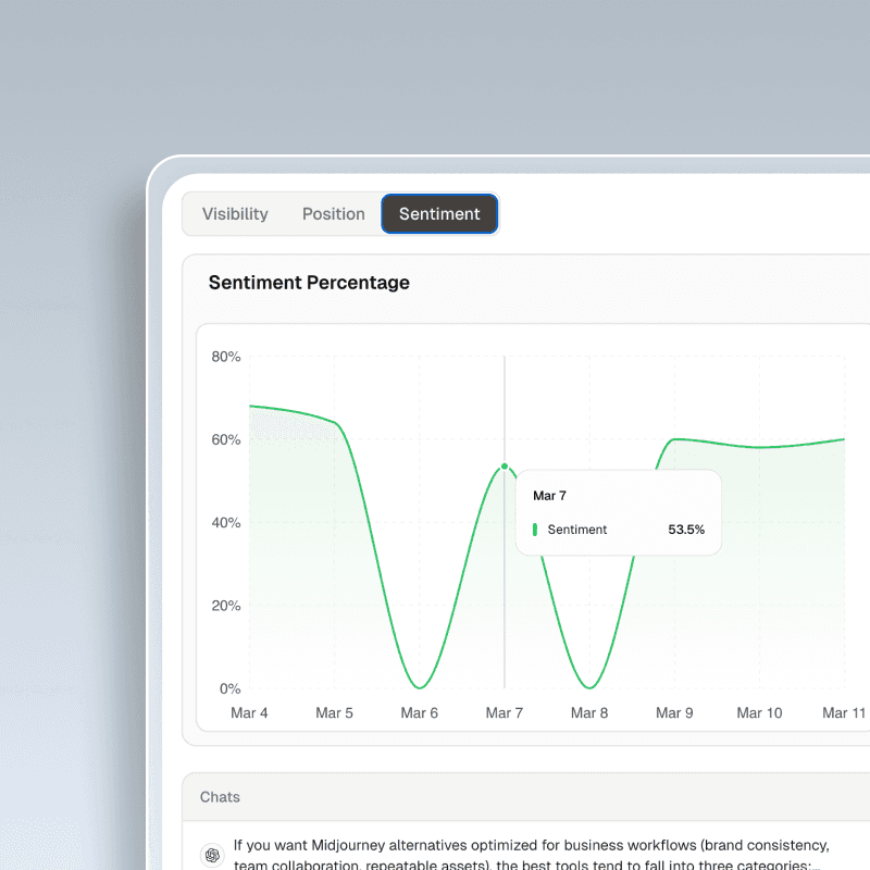 AI Overviews doesn’t only decide whether it mentions you—it decides how it describes you. Monitor sentiment over time and trace shifts back to exact answer excerpts.