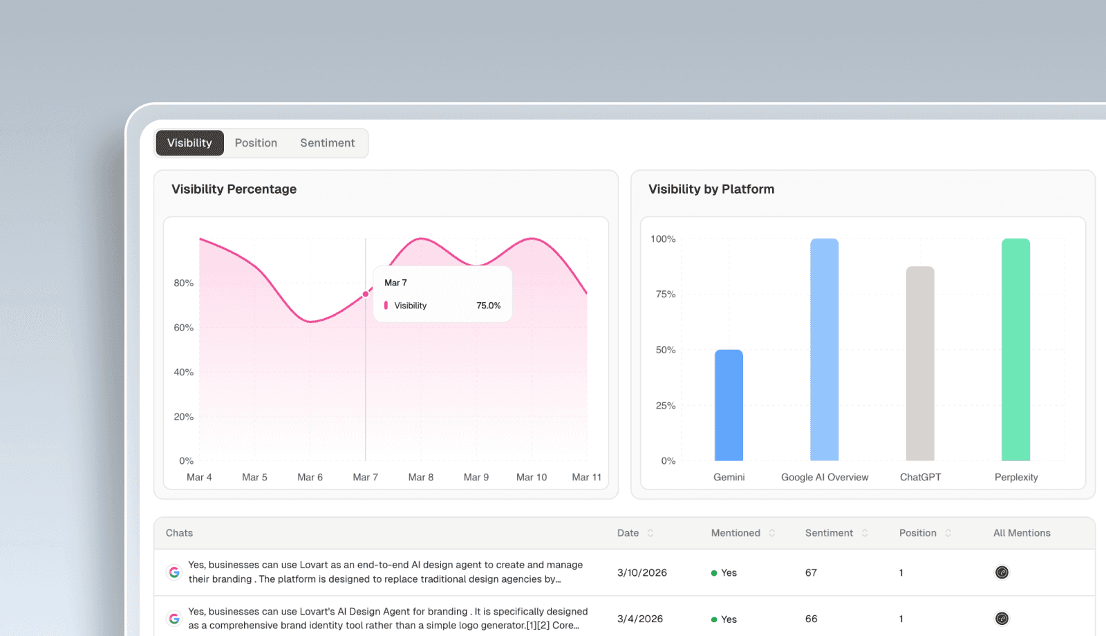 Track brand mentions and relative positioning for the prompts that matter most. Visibility without context is noise; position vs competitors is what changes outcomes.